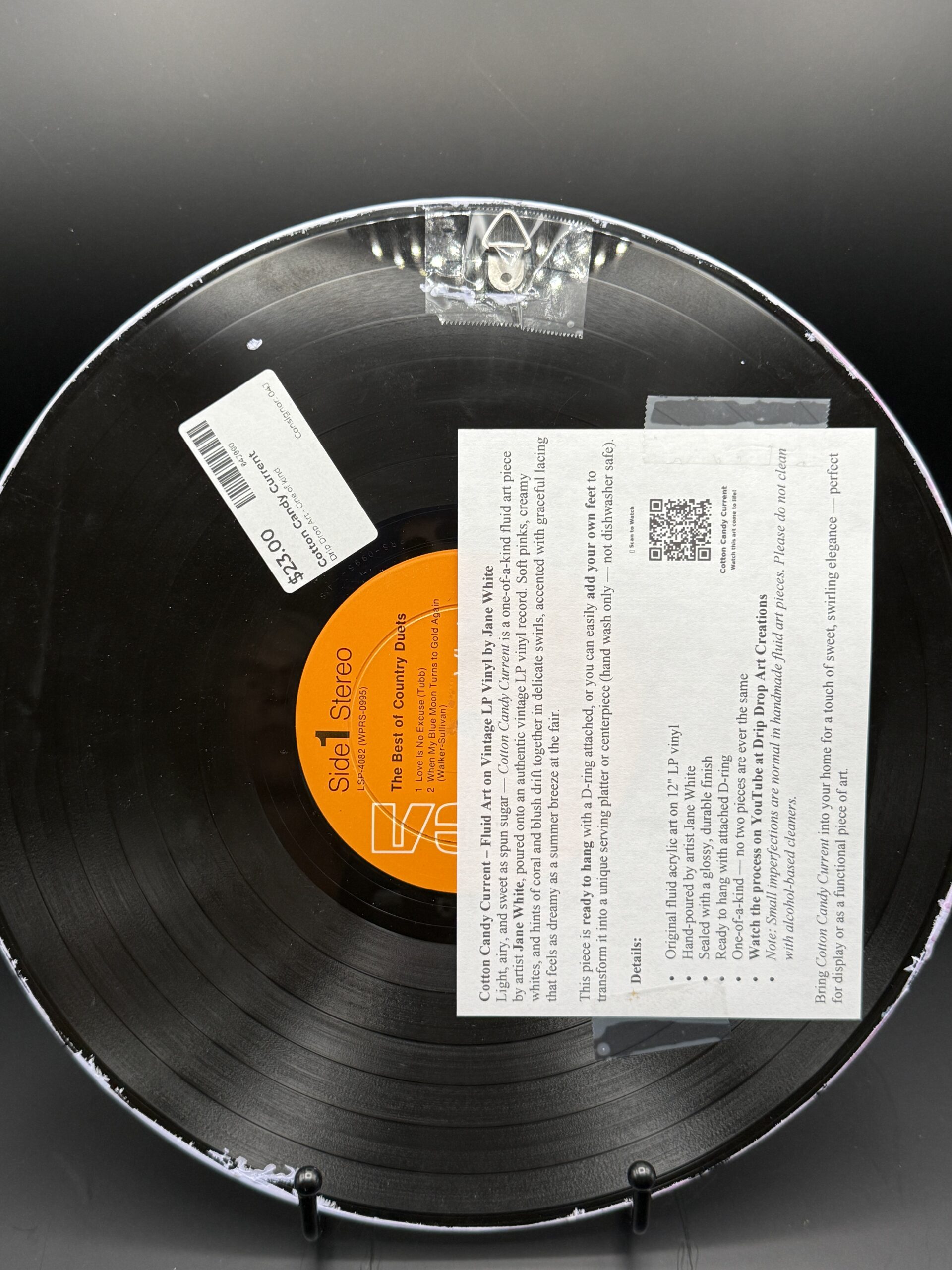 Light, airy, and sweet as spun sugar — Cotton Candy Current is a one-of-a-kind fluid art piece by artist Jane White, poured onto an authentic vintage LP vinyl record. Soft pinks, creamy whites, and hints of coral and blush drift together in delicate swirls, accented with graceful lacing that feels as dreamy as a summer breeze at the fair.