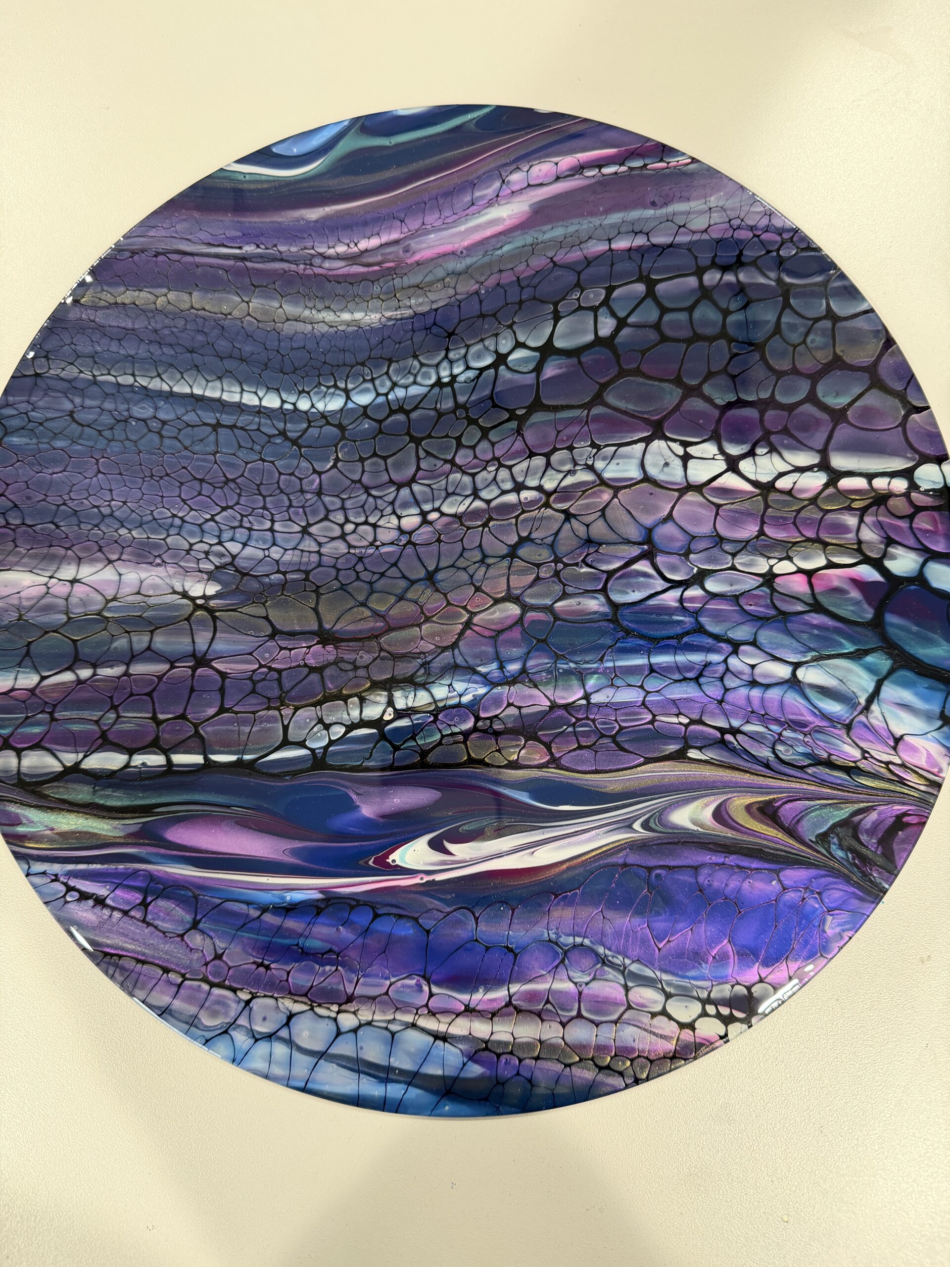 Evening Tide is pure serenity in motion — an elegant blend of deep indigos, violets, and pearly shimmer flowing together like dusk settling over calm water. Intricate webbed cells ripple through the surface, creating a hypnotic, scale-like pattern that glows when the light hits it just right.