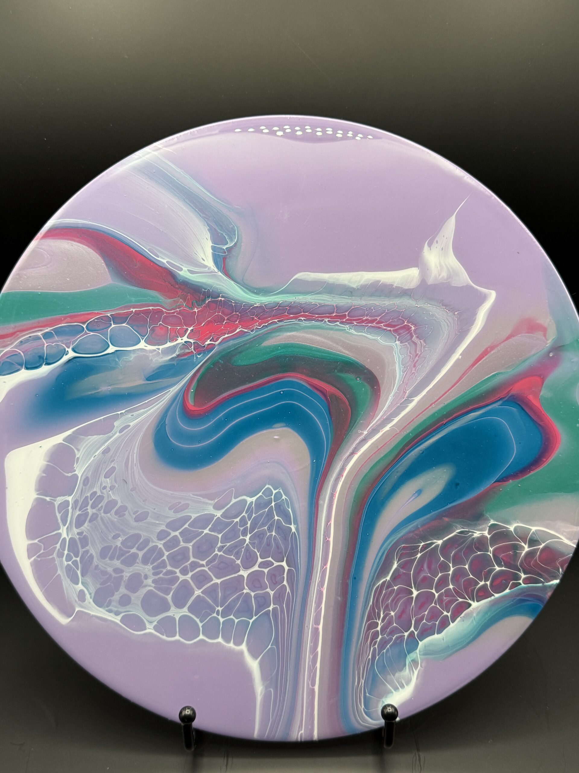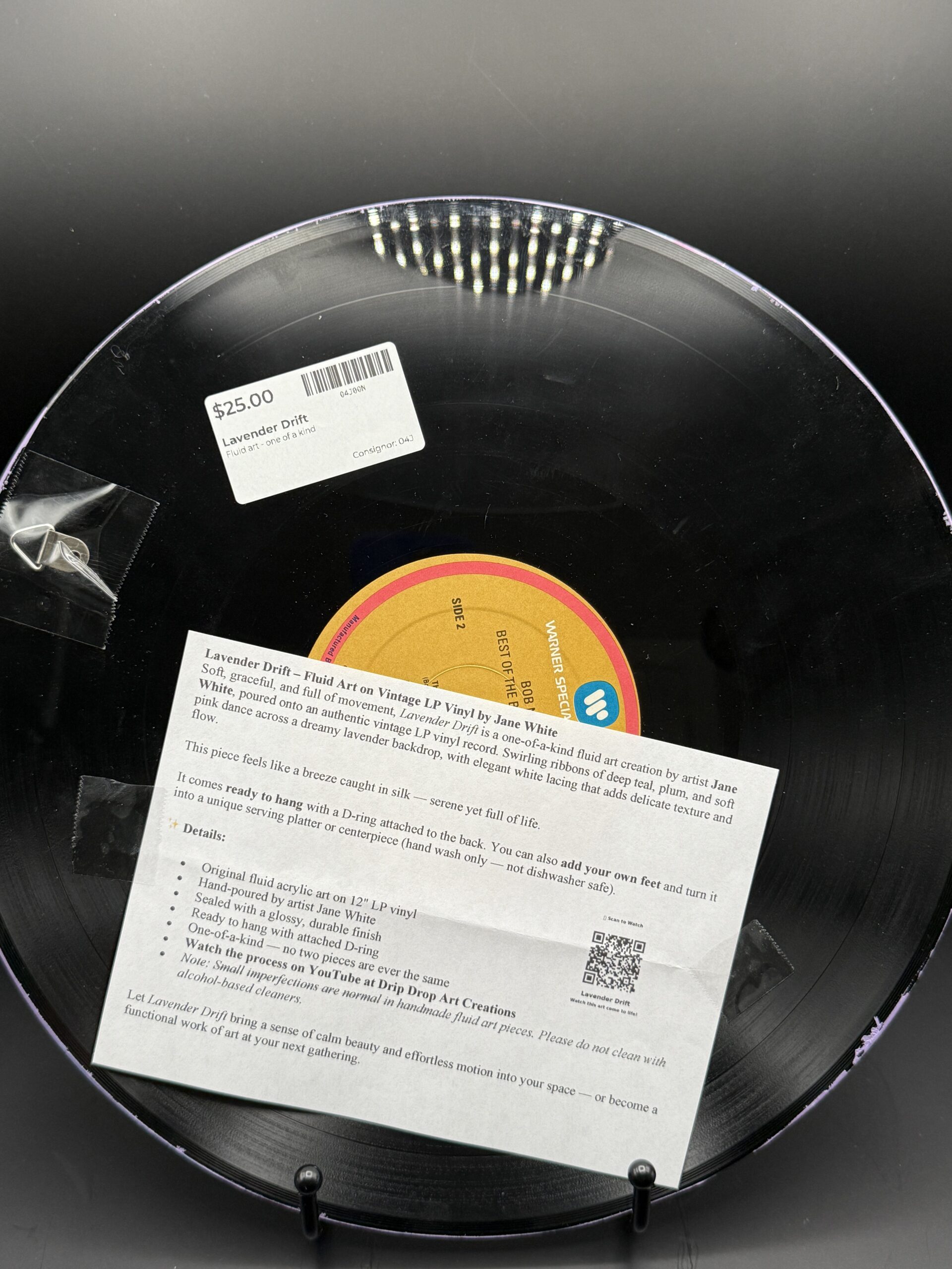 Soft, graceful, and full of movement, Lavender Drift is a one-of-a-kind fluid art creation by artist Jane White, poured onto an authentic vintage LP vinyl record. Swirling ribbons of deep teal, plum, and soft pink dance across a dreamy lavender backdrop, with elegant white lacing that adds delicate texture and flow.