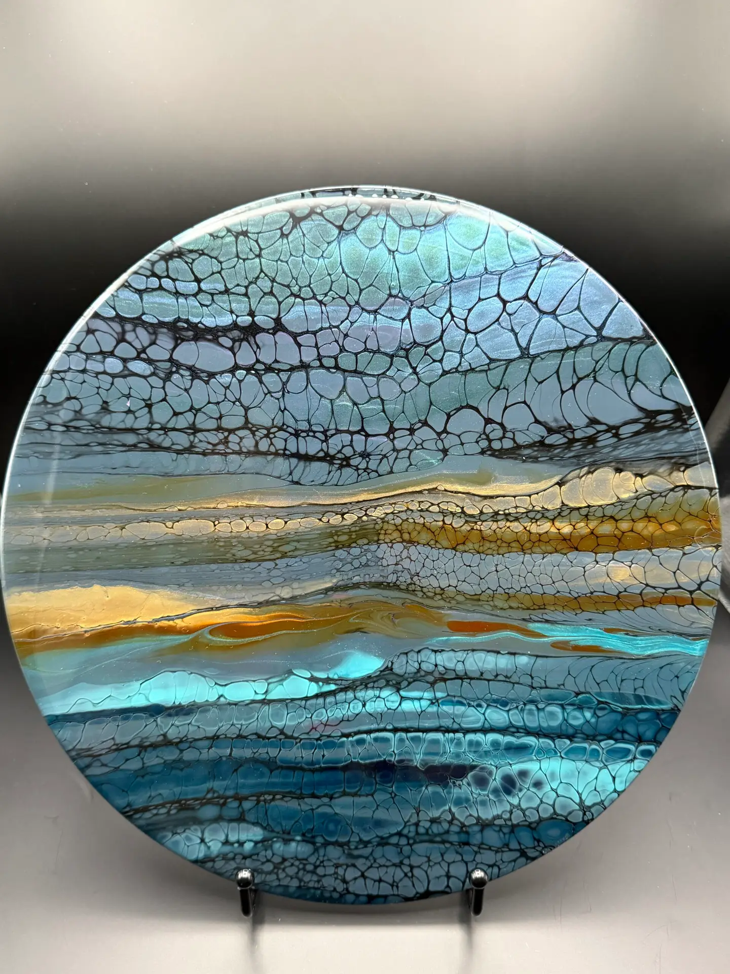 Golden Horizon by Jane White is a one-of-a-kind fluid art piece created on a repurposed LP vinyl record. Rich ribbons of shimmering gold flow across moody teal and smoky lavender, accented by intricate black-laced cells that give it depth and movement. This striking artwork was created using the SheleeArt bloom technique, making it a true conversation piece. Watch it come to life on my YouTube channel, Drip Drop Art Creations.